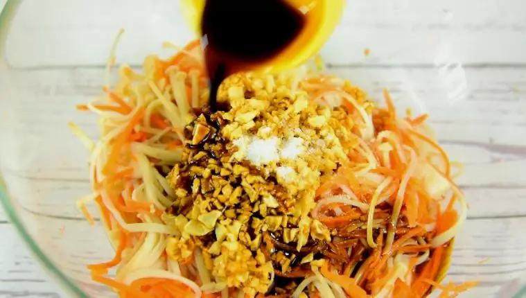 金针菇经沸水焯过后过凉水可使其爽脆, 再配以应季的小蔬菜丝, 最后用料汁调匀即可。