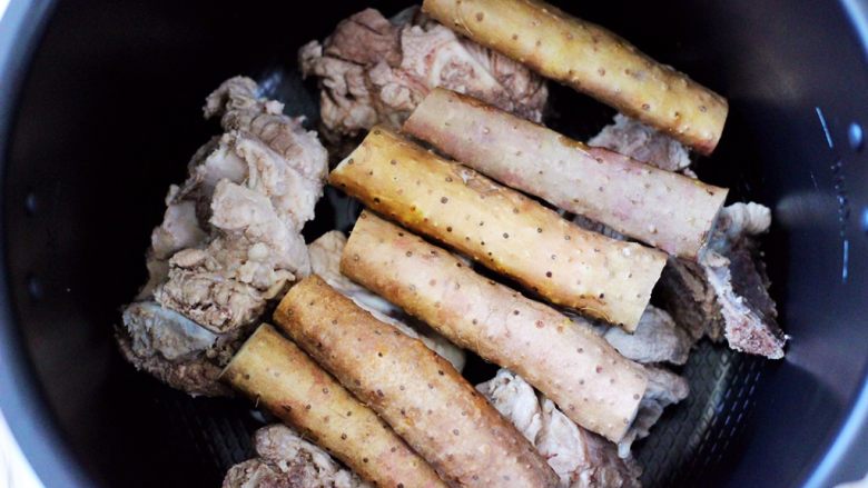10. 先把焯过水的筒骨和铁杆山药段放入锅中。