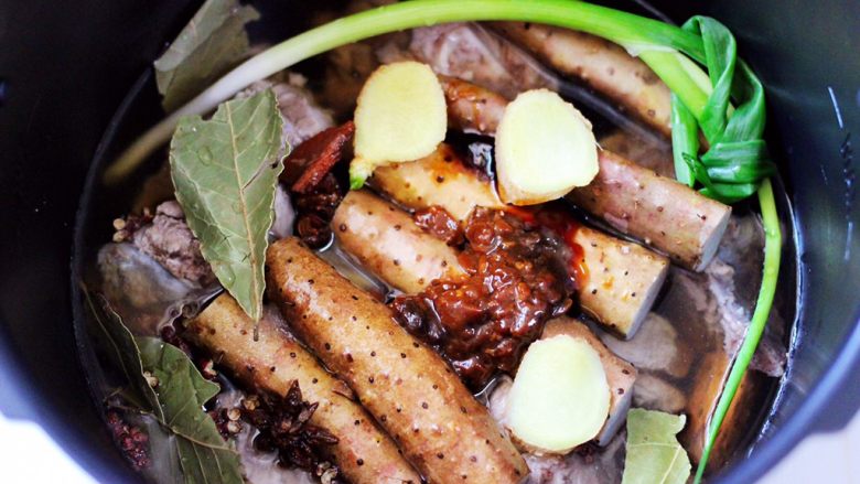 12. 这个时候放入葱姜和香叶,八角和花椒,桂皮和肉蔻。