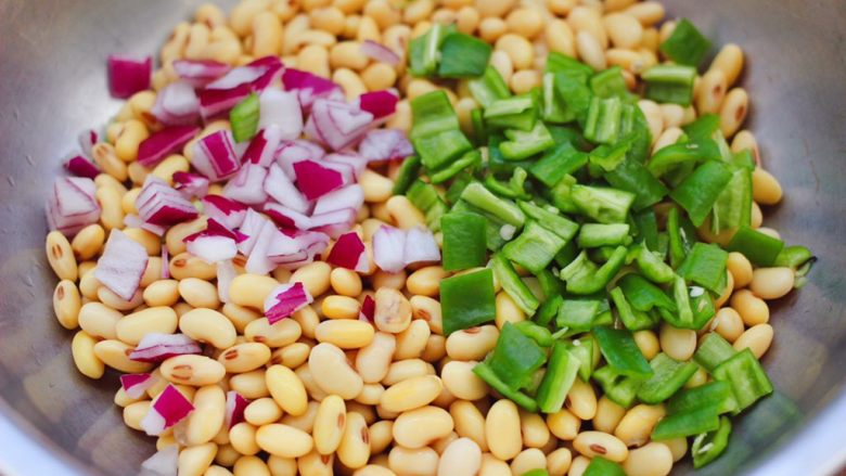 10. 把煮熟的黄豆,捞出沥干水分,放入一个大一点的容器里,加入切丁的洋葱和青椒。