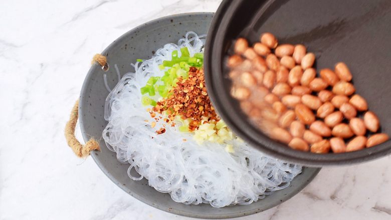 9. 再连同油一起浇倒在蒜末葱花辣椒面上爆出香味