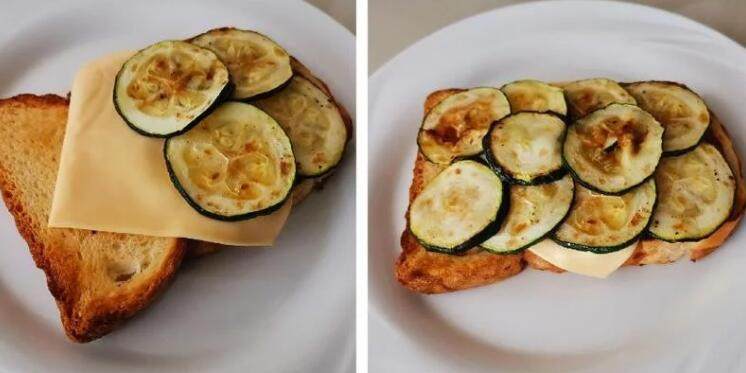 5. 开始组装咯~土司+芝士片+节瓜/黄瓜