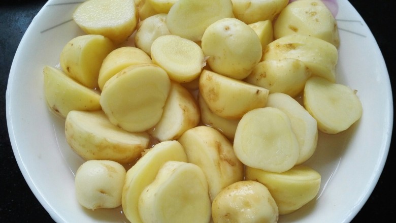 2. 用不锈钢勺刚土豆表层的皮刮去
