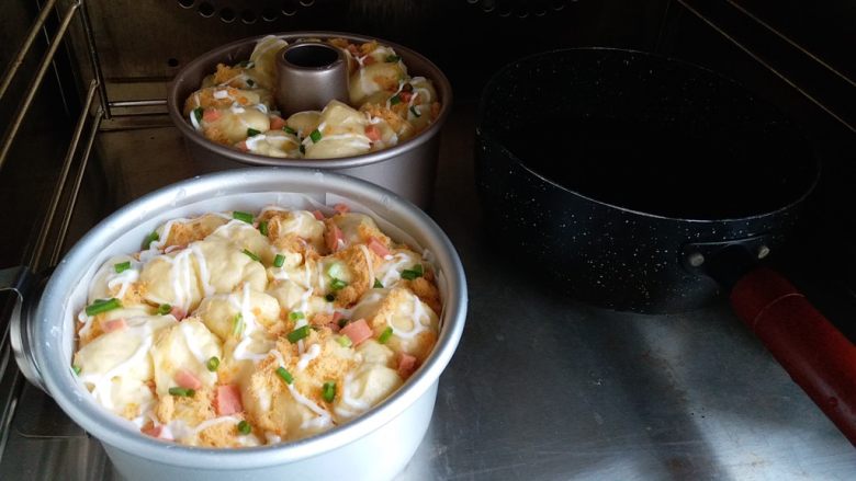10. 然后放入烤箱二次发,旁边放一碗热水增加湿气。