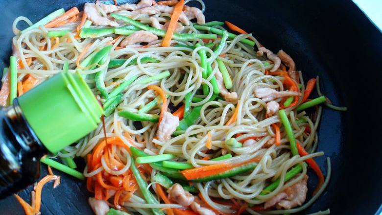 6. 热锅凉油,油烧到7成热,下猪肉丝翻炒变色,加料酒、生抽、姜末翻炒均匀