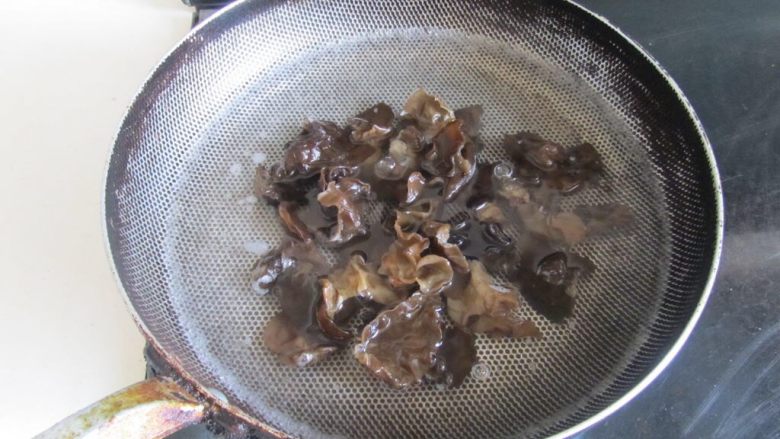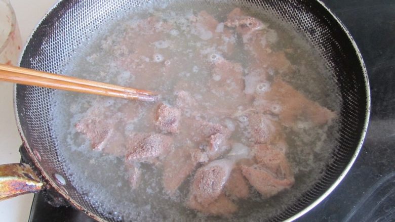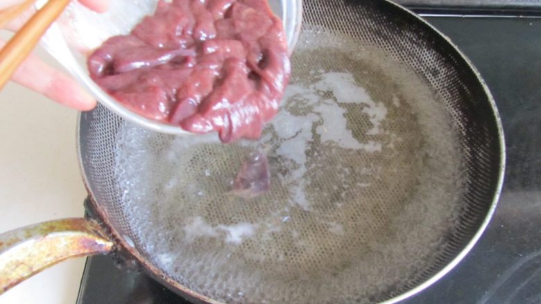 6. 猪肝下锅后用筷子快速划散,关火,猪肝在锅中烫2分钟