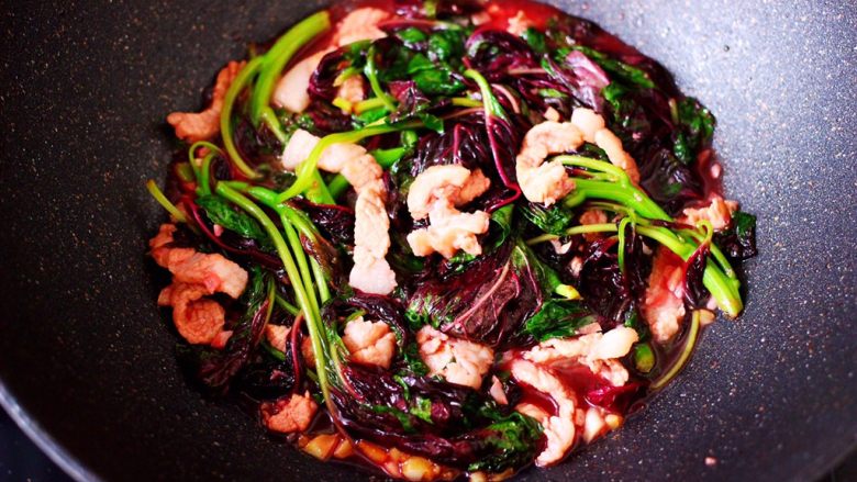 14. 锅中看见苋菜断生,汤汁变成红色的时候。