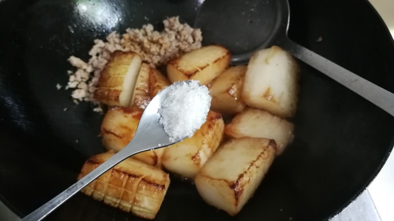 14. 放入一小勺糖翻炒均匀