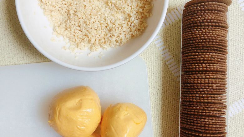 11. 将南瓜糯米面团揉成一个个小圆球。准备好了和饼干和白芝麻。