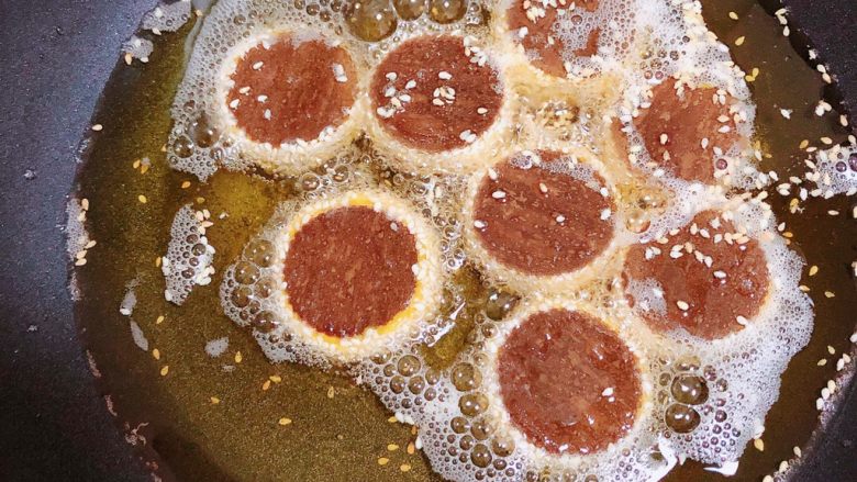 17. 锅中热油,油热至6成热度时,放入夹心饼。中小火煎至2分钟。