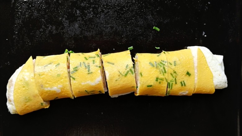 10. 两张蛋重叠,然后卷起来(蛋黄的皮在外层)
