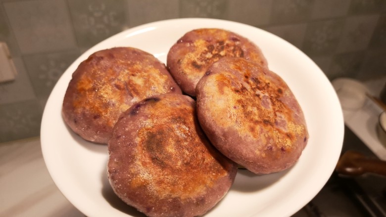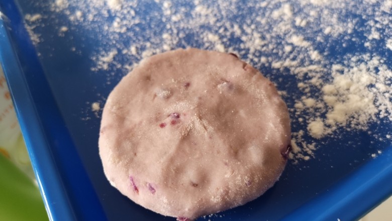 9. 拿一个小的紫薯面团儿,用手压成饼的形状。