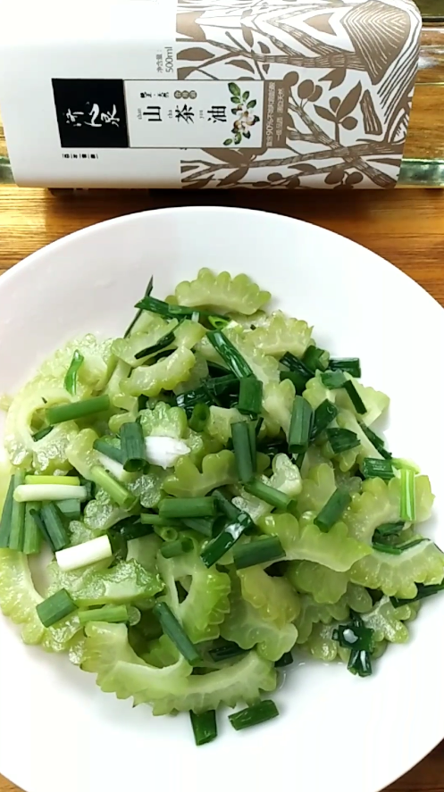 2. 洗净准备好的苦瓜和小葱。 准备山茶油,山茶油的口感清醇原香,不油腻的口味,更适合炎热的夏天。