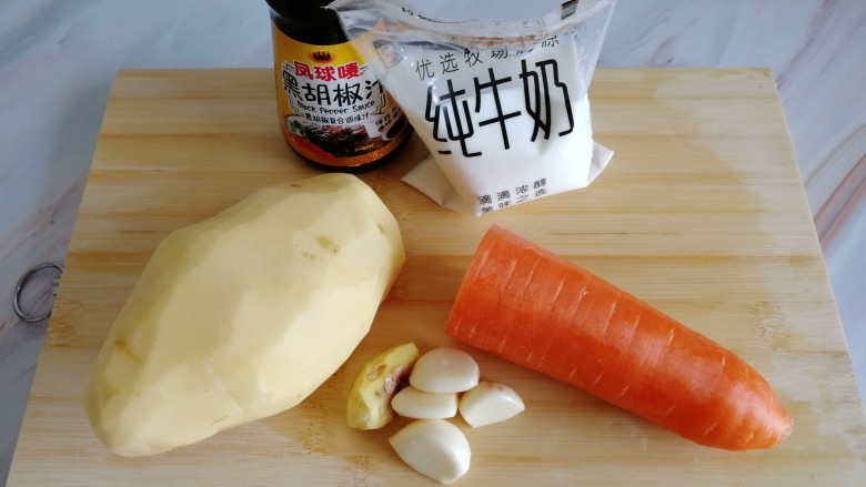 5. 把切好的胡萝卜丝、土豆丝、生姜大蒜末装盘,备用
