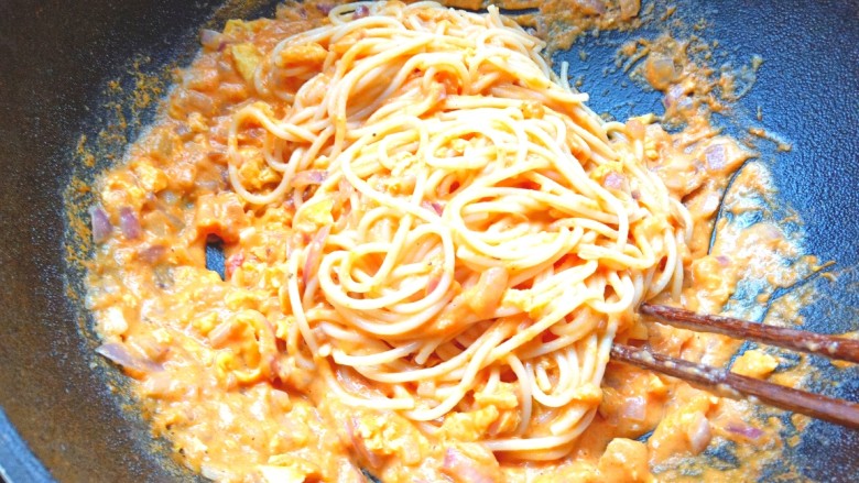 17. 下入意面用筷子搅拌均匀,用筷子卷好意面放入盘子。