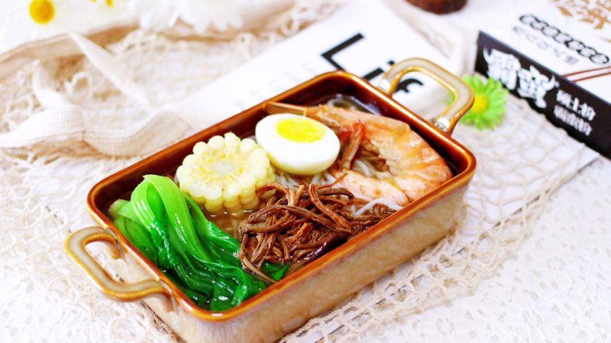 11. 上面铺上玉米和鸡蛋、对虾和小油菜,再浇入调料包即可享用了。