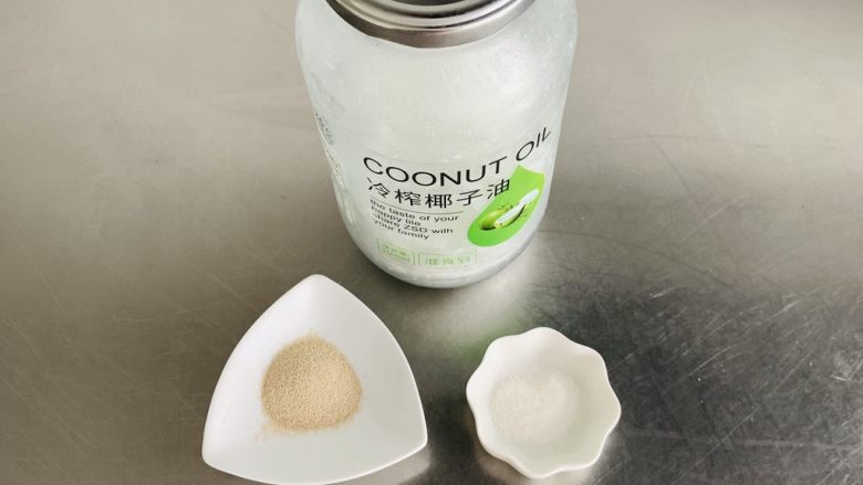 4. 酵母用20克的凉水花开,椰子油提前从冰箱里拿出来软化。