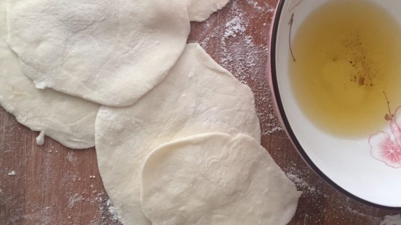 12. 以此类推叠加五张,再擀成手掌大小的皮