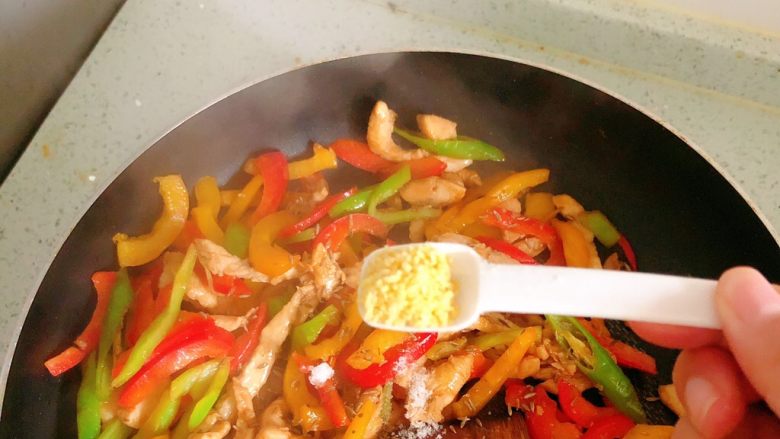 6. 鸡肉小火炒至变色,大概这个程度就可以了