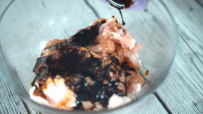 2. 肉末中加少许糖、生抽、老抽拌匀。