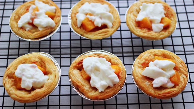 8. 蛋挞皮里,依次放入切丁的黄桃。