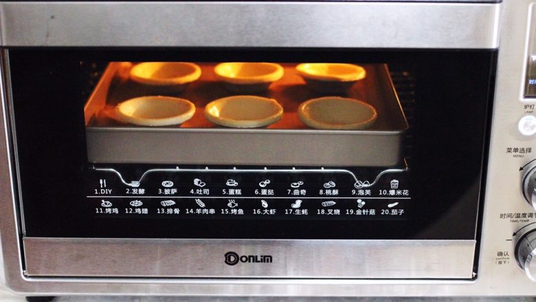 3. 烤箱200度预热10分钟后,把蛋挞皮放入烤箱中层。