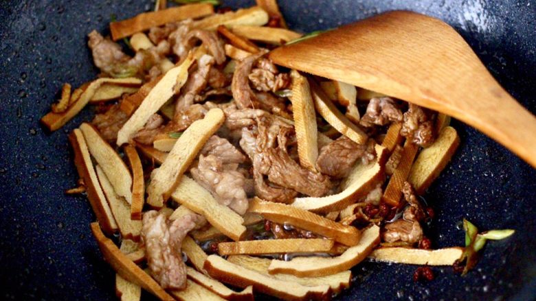 9. 这个时候加入豆干,继续大火快速翻炒均匀。