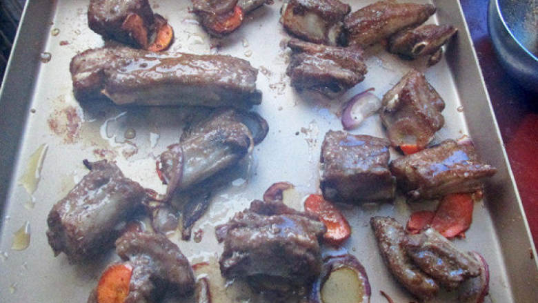 6. 把胡萝卜和洋葱铺下面,羊排摆上,这样羊排即不会粘烤盘,还不易失水