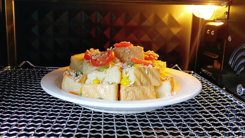 8. 撒上煮熟的蔬菜粒,铺上番茄片,撒上燕麦