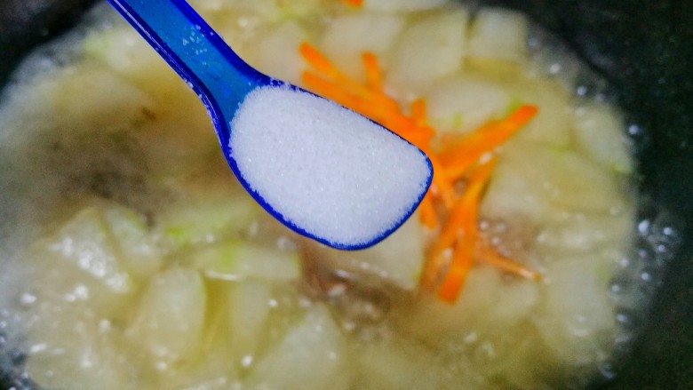 4. 热锅热油,加入姜丝葱白爆香,加冬瓜翻炒2分钟。