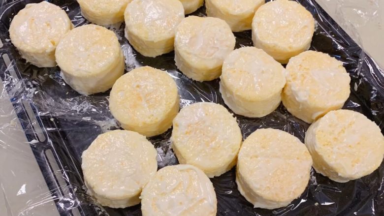3. 用小号饺子模具将蛋压切成一个个圆形小蛋糕。