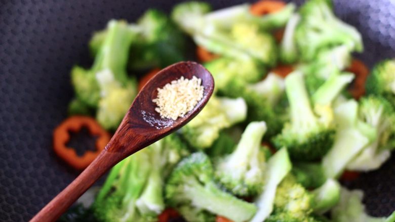 9. 这个时候加入西兰花,大火继续翻炒均匀。