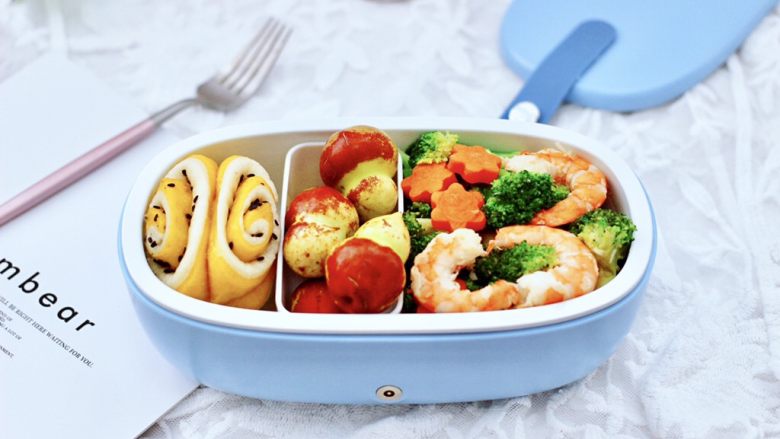 14. 便当盒里面,放入葫芦冬枣和红薯双色花卷,再放入炒好的虾仁西兰花,美美的便当就做好了。