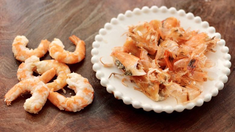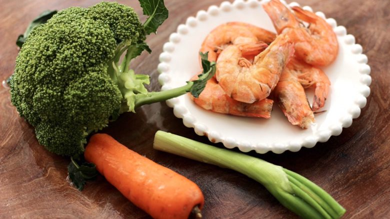 2. 把煮熟的海虾捞出沥干水分,准备好其它的食材。