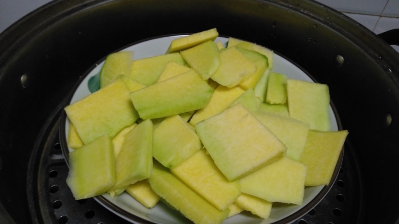 13. 活成面团,南瓜、山药、红薯、胡萝卜分别用擀面杖捣碎,加入糯米粉活成光滑的面团。