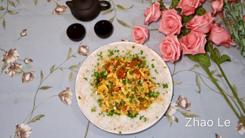 30. 炒好的西红柿鸡蛋浇在米饭上,撒上葱花即可