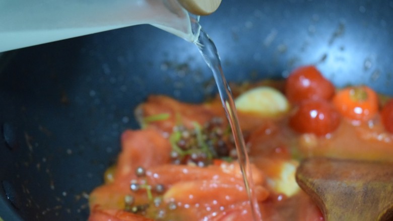 18. 【菜品制作4-1】等到番茄超不多已经软烂出汁儿了,就可以倒入清水