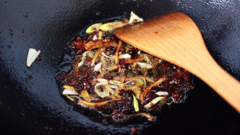 7. 这个时候加入葱姜,大火快速爆出香味后。