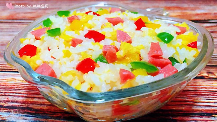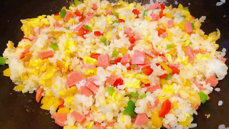 8. 放入青、红、黄椒粒翻炒但不要时间过长