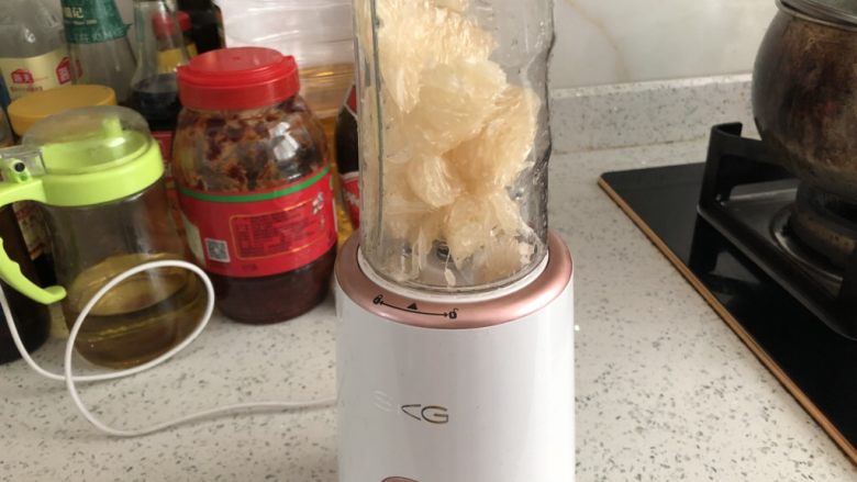 3. 柚子肉泥过滤,留下60g柚子汁。