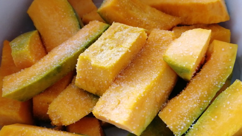 11. 油温6-7成热时,中火,一个一个的把南瓜条放入油里。炸3分钟。