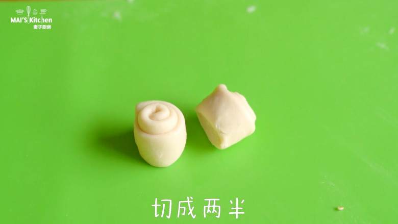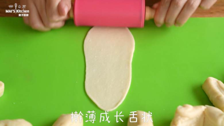5. 分成等量的10等份,将每一份擀成长舌状,两边以中心叠起,再擀一次,卷起来