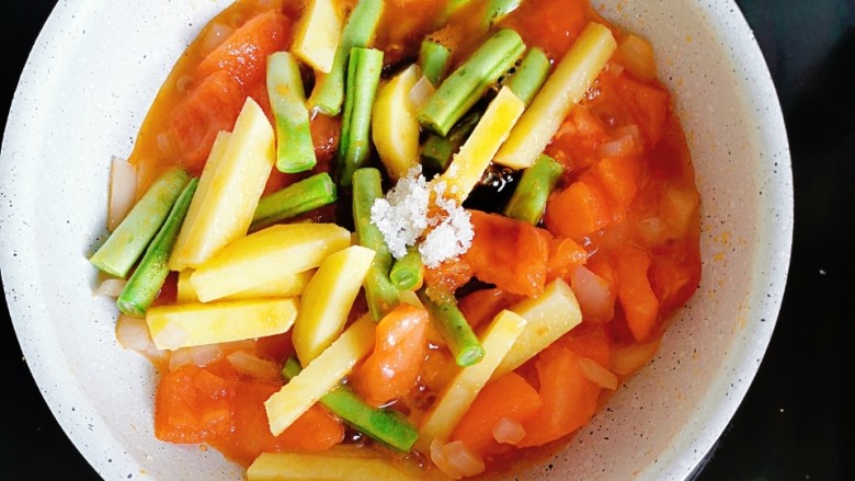 3. 倒入土豆和豆角翻炒均匀