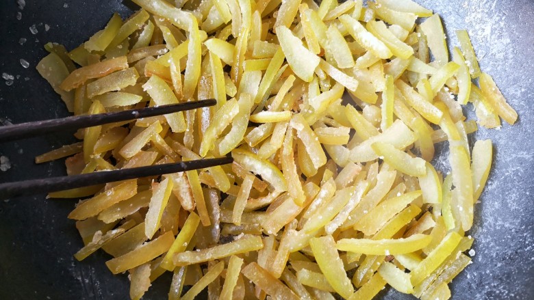 9. 倒入挤干水的柚子皮中大火用筷子快速翻炒至吸干所有冰糖浆。