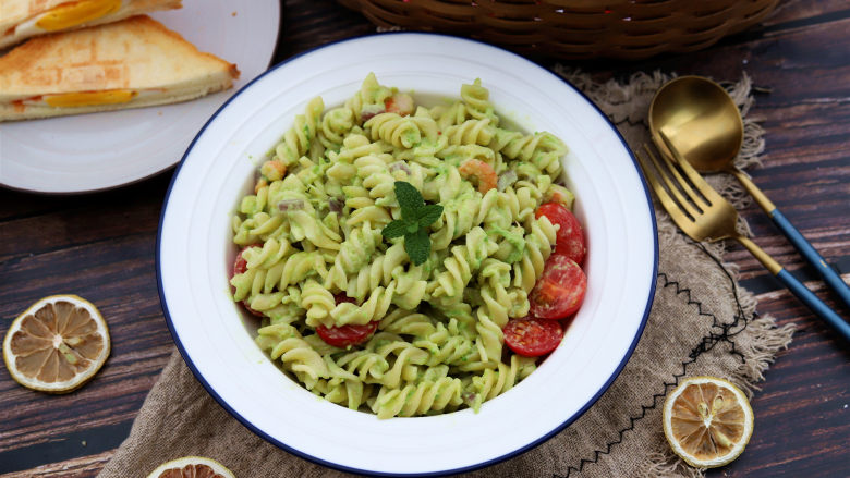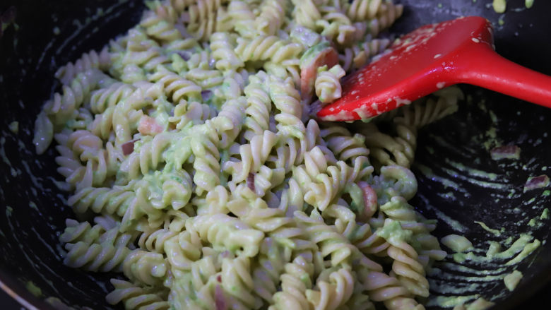 我家小朋友特别喜欢吃意大利面,我经常会用披萨酱或者意大利面酱做给孩子吃,有次忽然听朋友说牛油果也可以用来做意大利面,我一想,牛油果做意大利面,那不是黑暗料理吗?我喜欢一切传统的经典的口味,这种奇葩的口感一直不敢尝试,今天刚好冰箱里剩下最后一个牛油果,索性吃一次试试,没想到,用牛油果做意大利面竟然一点也不违和,那种清香而厚重的口感让人吃第一口就爱上,我做了两盘,孩子瞬间就扫光了。