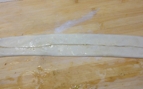 4. 揉好的面团分成几份,擀成大长片,稍薄些。刷上葱油。