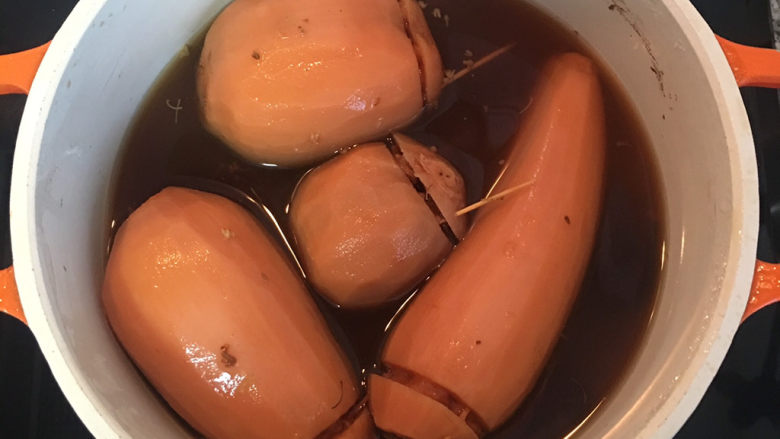 9. 开锅盖,倒入桂花蜜,盖回锅盖续煮15分钟后,关火焖到降温,便可移入冰箱冷藏过夜;
