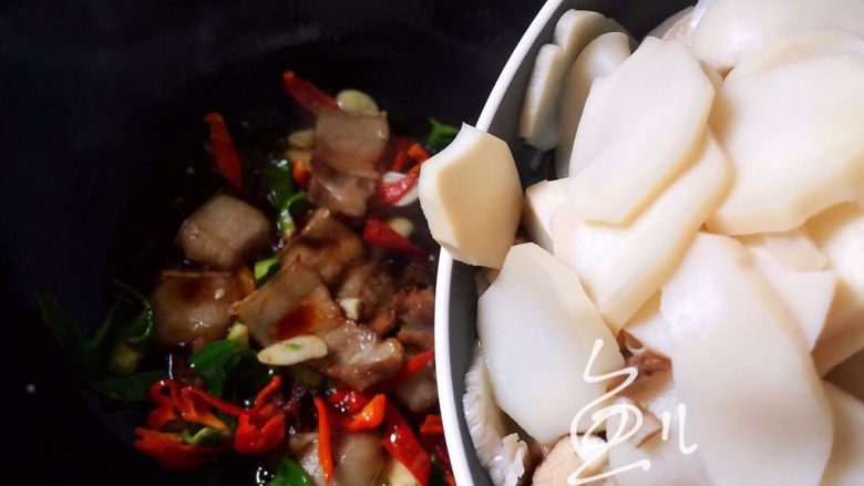 8. 肉片变色后,放入青红椒和蒜片翻炒均匀