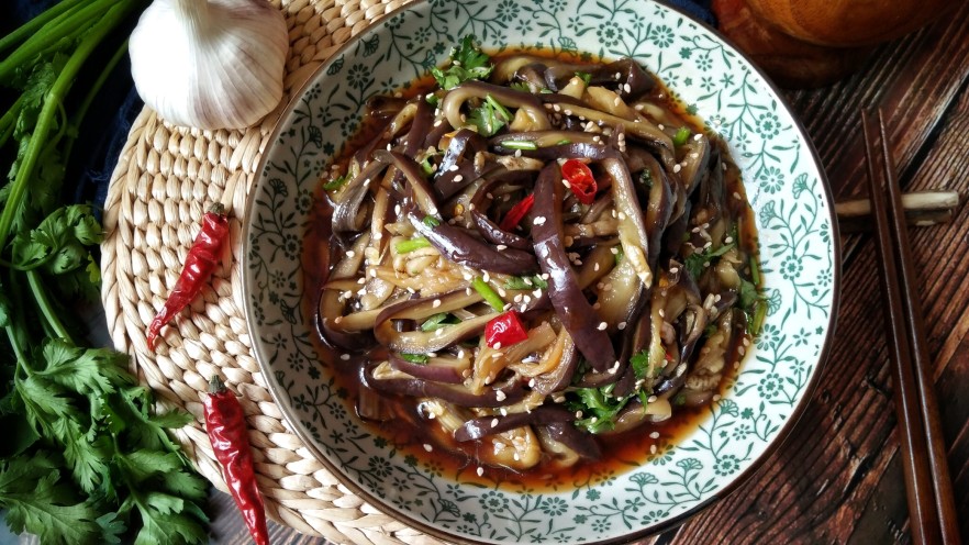 9. 在撕好的茄子丝上浇上调好的凉拌汁。