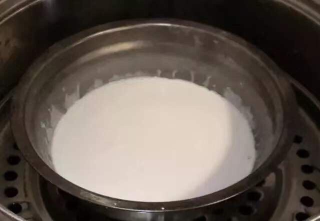 3. 3、然后,在蒸锅内加入足量的清水,把牛奶和糯米粉混合后的液体放入蒸锅中,用大火蒸10分钟,将其蒸至凝固。